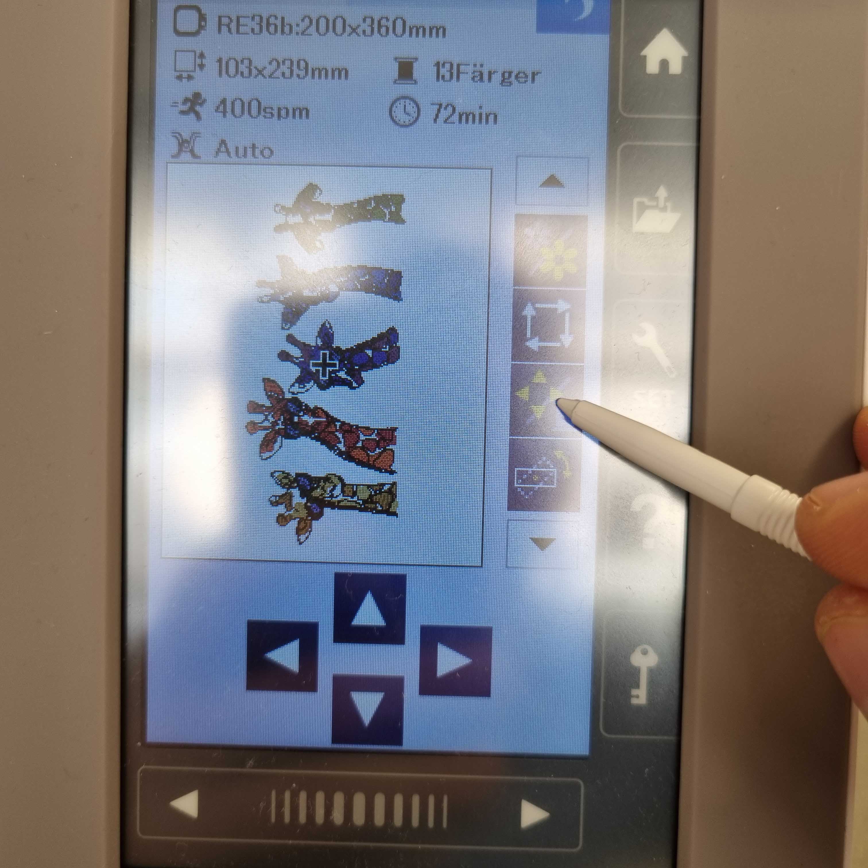 Efter ramen är monterad och broderiet är valt i maskinen så vill vi positionera det korrekt. Tryck på symbolen som pennan på bilden pekar på och flytta sedan ramen med hjälp av de 4 pilarna under bilden på broderiet. Det är viktigt att maskinen är på stygn noll när detta görs. D.v.s. innan broderiet har börjat eftersom nålpositionen då är i broderiets mitt.