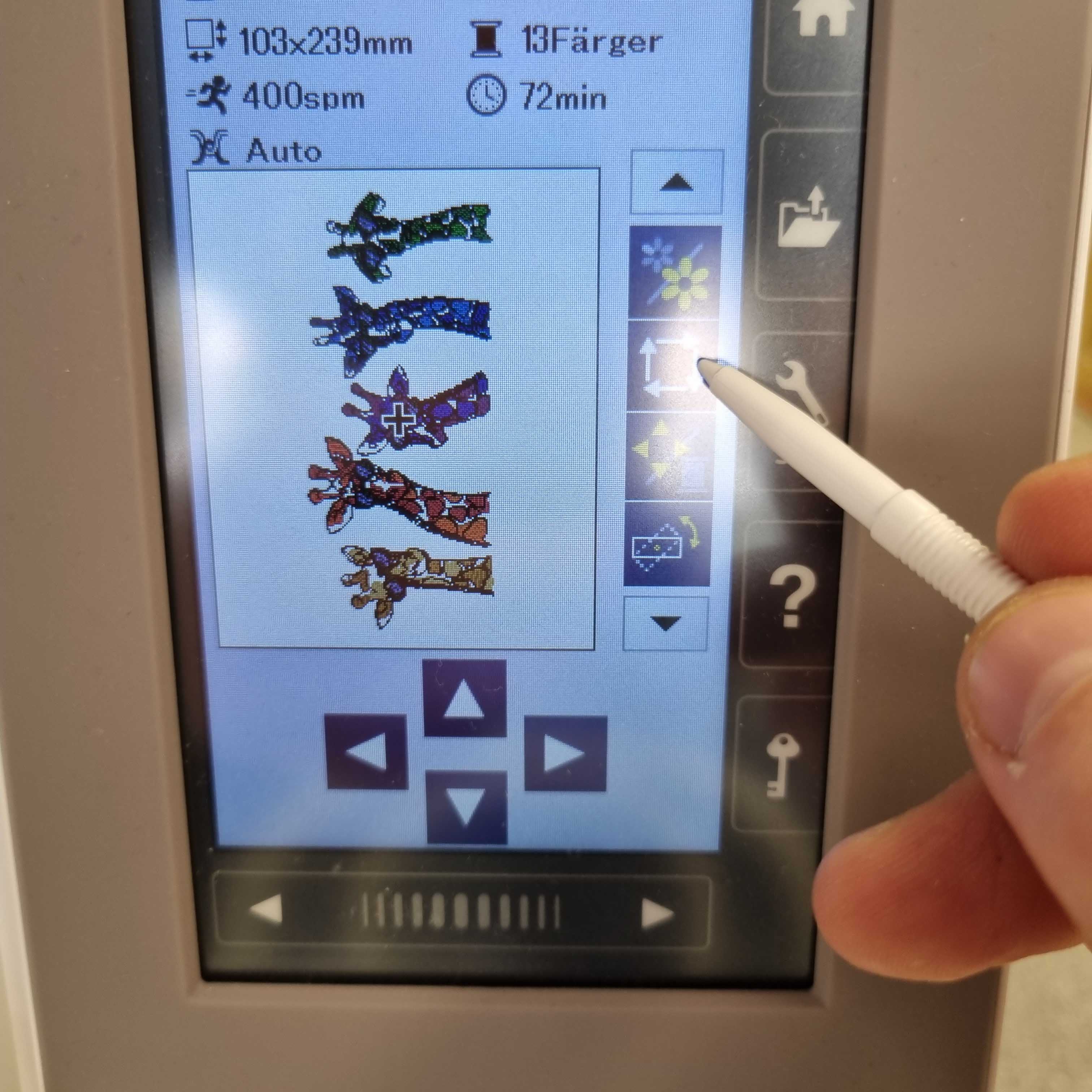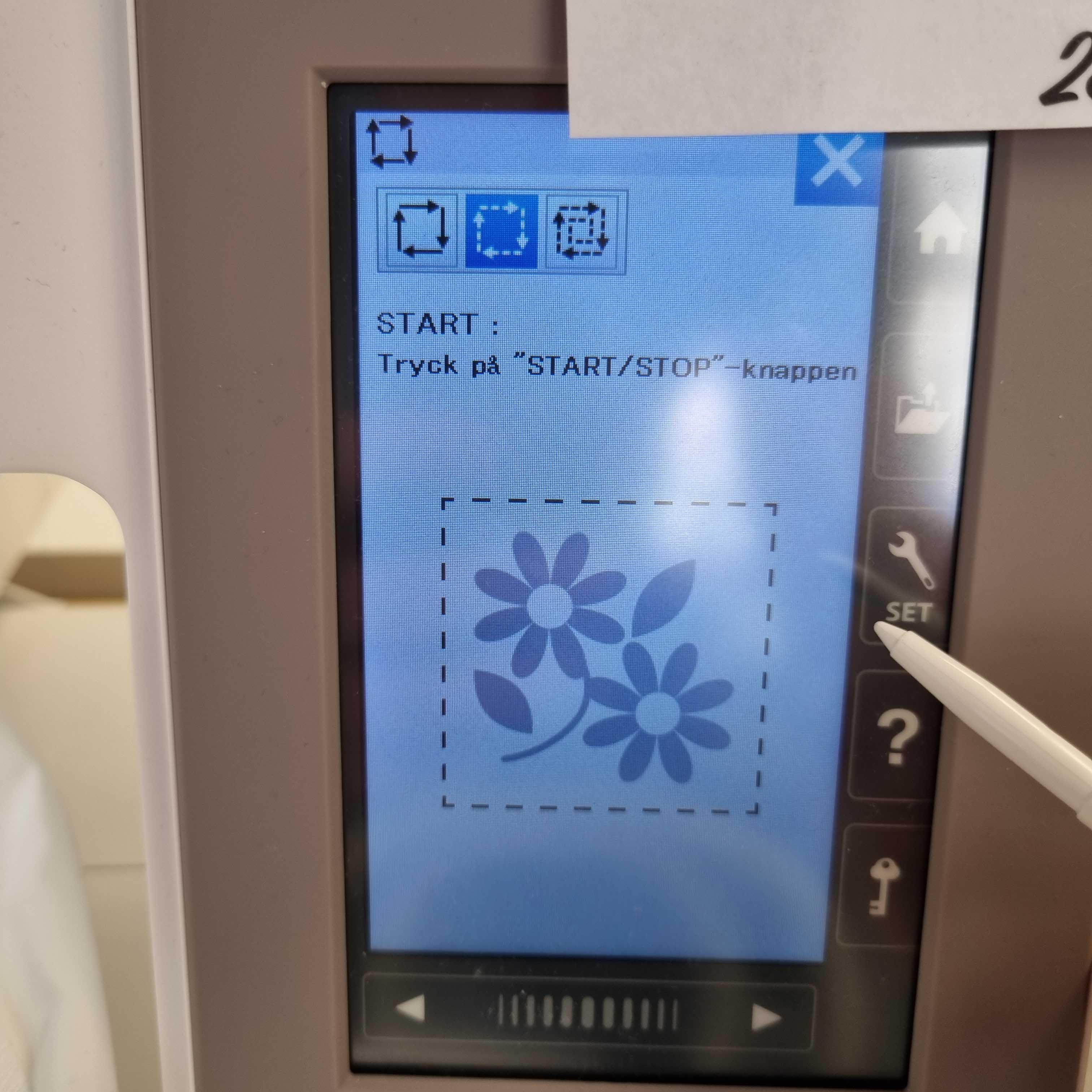 Sedan kan du tråckla fast med en inbyggd funktion i maskinen. Tryck på symbolen med 4 pilar i en kvadrat som pennan pekar på.