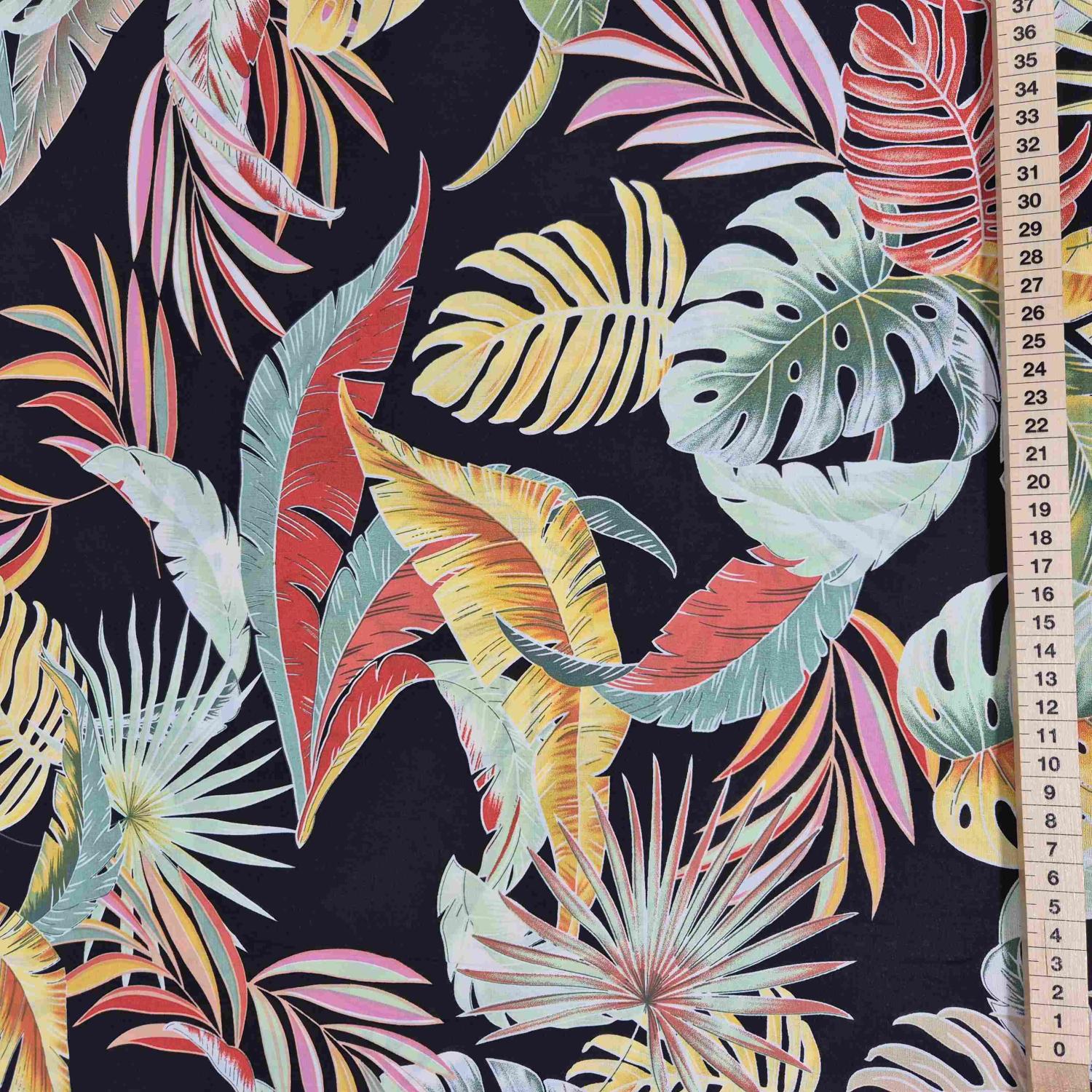 Följ med in i tropikerna med detta mjuka viskostyg i 100% vävd viskos. Tyget har ett uttrycksfullt tryck med stora, färgstarka blad mot mörk botten – perfekt för klänningar, blusar, byxor eller kjolar med mycket rörelse och karaktär.