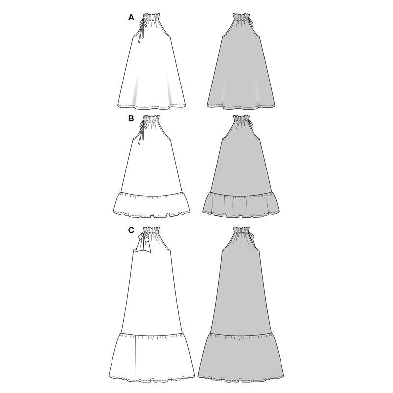 Sy din drömklänning till sommaren och välj själv hur lång den ska vara. Det här mönstret innehåller tre varianter av en luftig halterneckklänning med volangdetaljer och ett generöst, bekvämt snitt. Perfekt för stranden, staden eller sommarfesten.