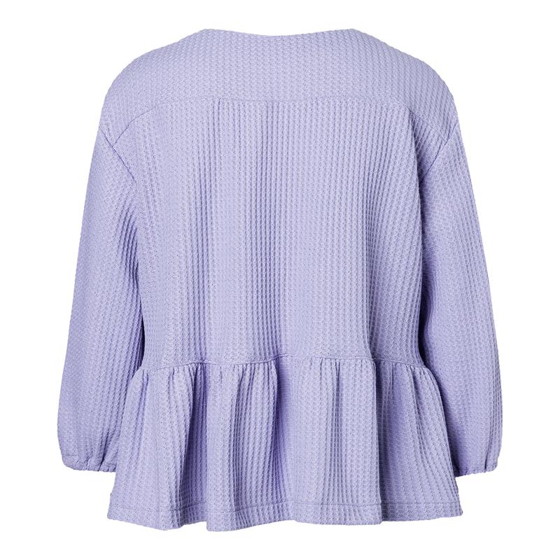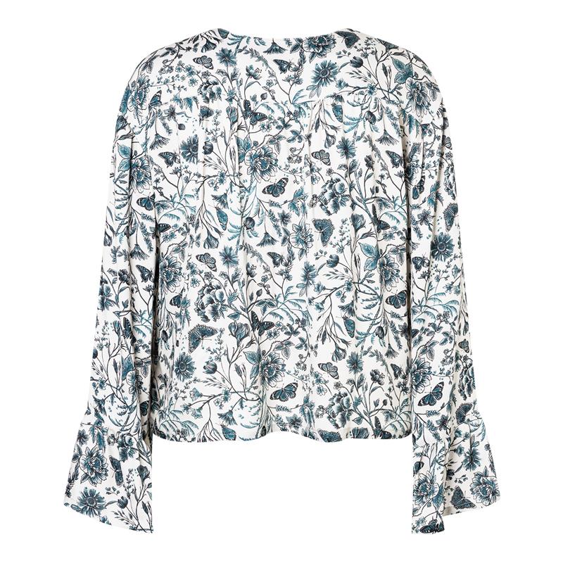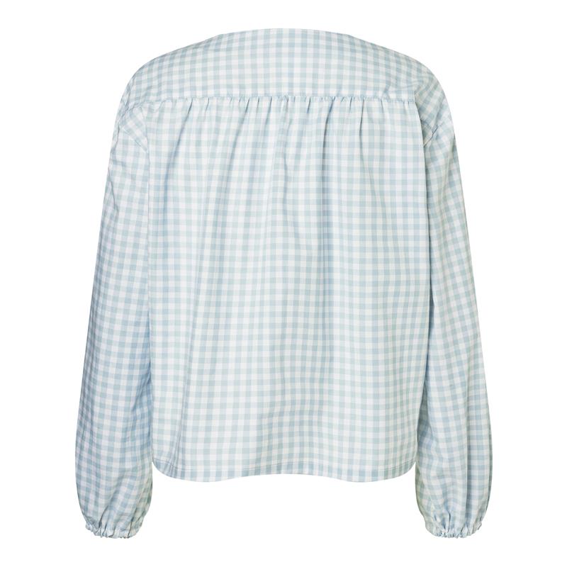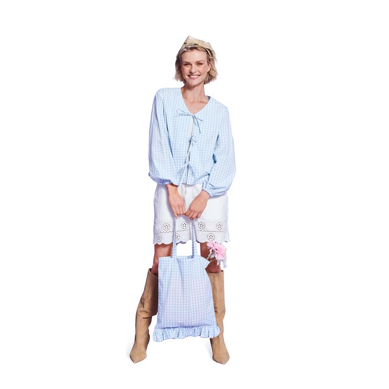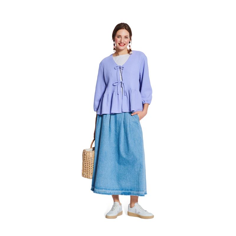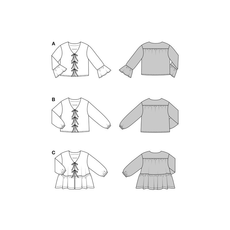 Modell A är en kortare blus med ballongärmar och knytband i halsringningen. Modell B är en längre blus med trumpetärmar och knytband, inspirerad av 70-talets romantiska stil. Modell C har en volangkant i nederkanten och lite längre passform. Alla tre är märkta superlätt och passar lika bra till jeans som till kjol.