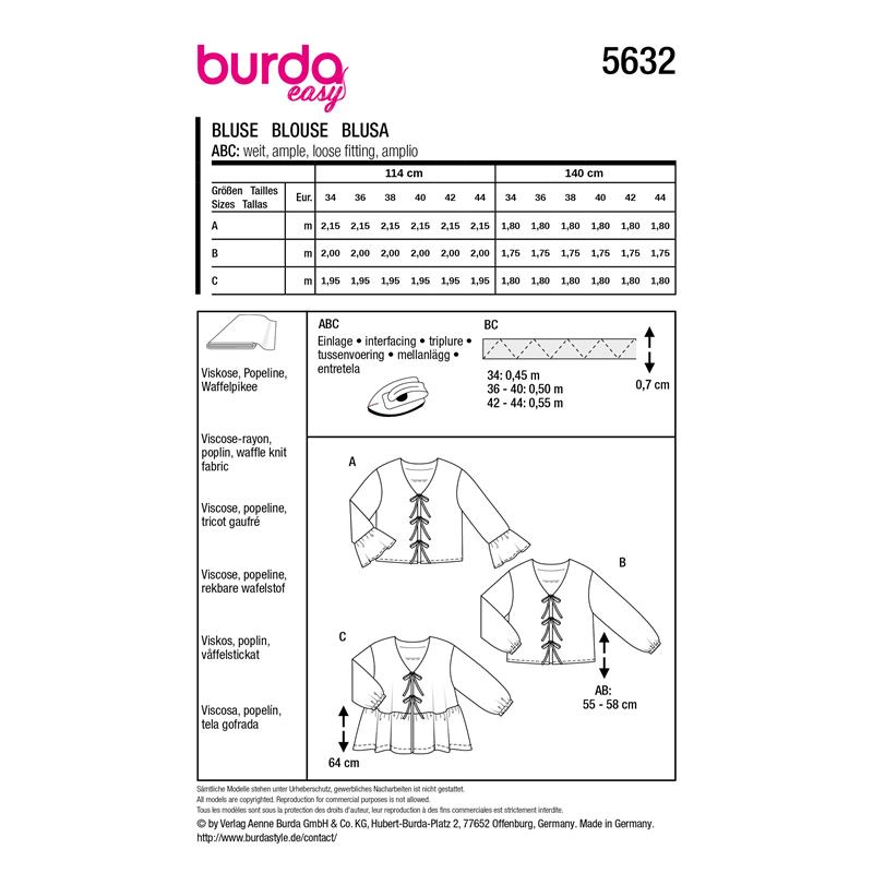Burda Easy 5632 innehåller tre blusmodeller i storlek 34 till 44. Alla tre har en ledig passform och passar poplin, viskos och liknande lätta tyger.