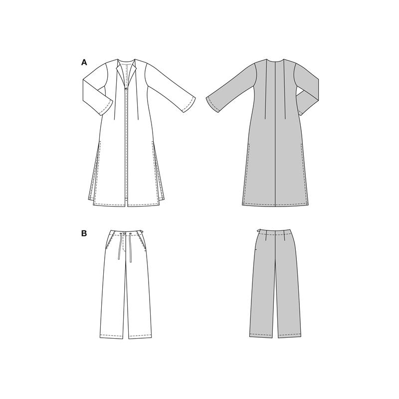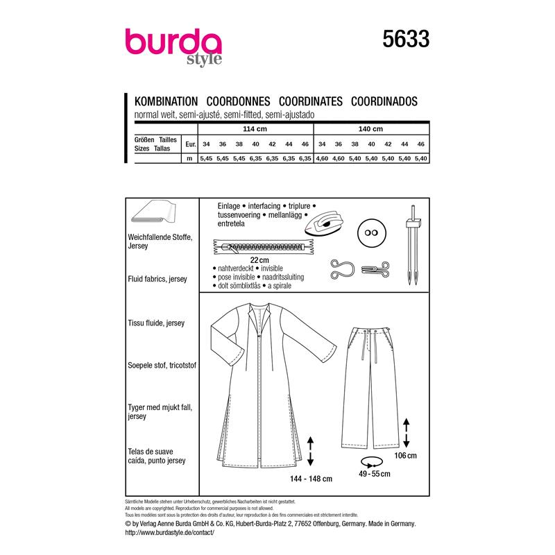 Burda Style 5633 är ett kombinationsmönster med en lång kofta och vida byxor i storlek 34 till 46. Koftan har höga sidoslitsar som ger rörelse och ett böljande fall, och byxorna är rakt skurna med resår i midjan. Båda delarna sys i jersey eller mjuka böljande tyger.