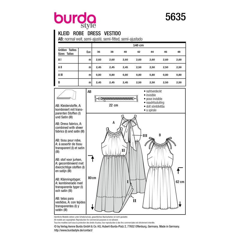 Burda Style 5635 innehåller två klänningsmodeller i storlek 36 till 48, båda med en feminin och festlig karaktär.