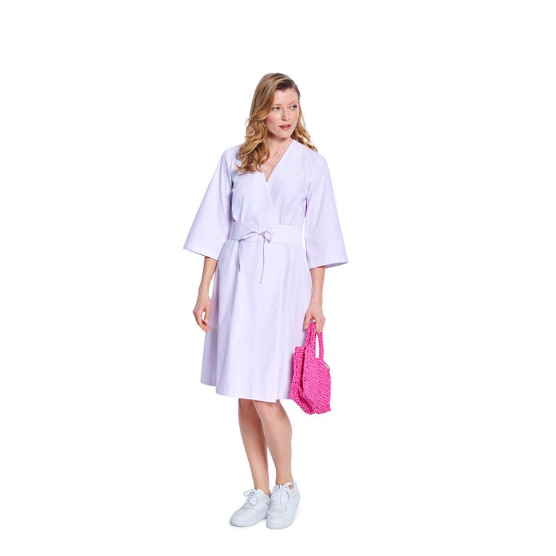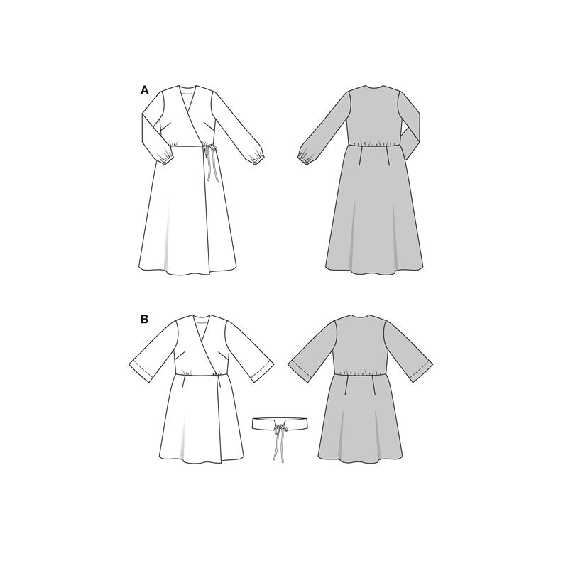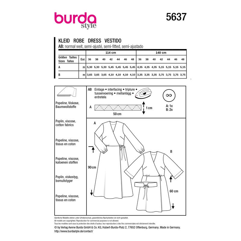 Burda Style 5637 innehåller två omlottklänningar i storlek 36 till 48. Båda har en ledig och bekväm passform och passar poplin, bomull och viskos.