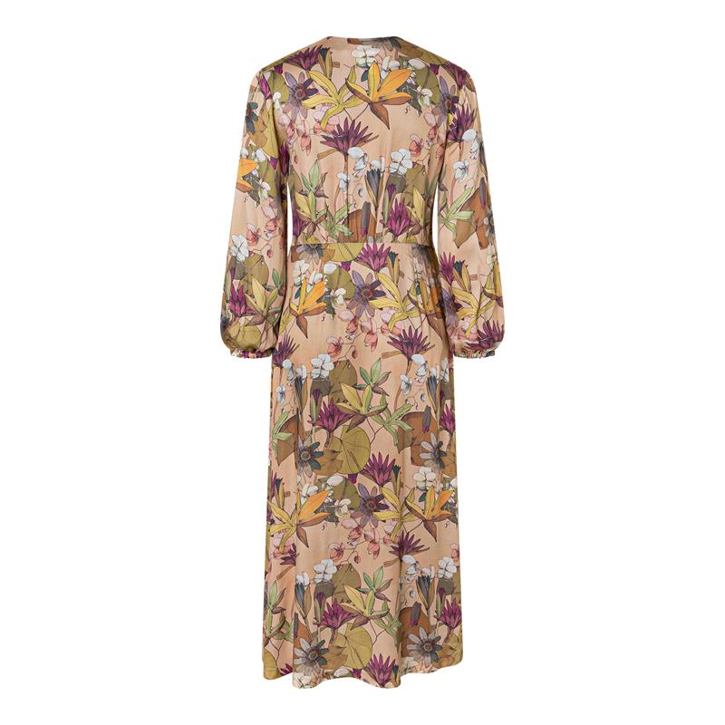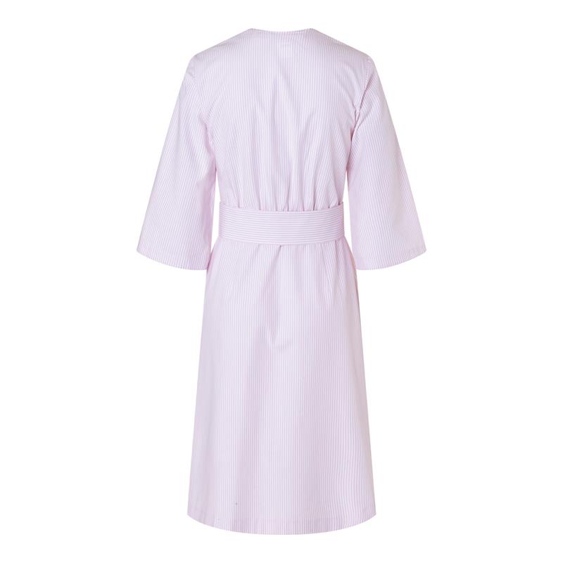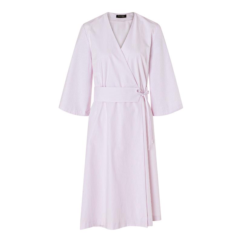 Modell A är en längre omlottklänning med vida ärmar som kan förkortas efter önskemål, och ett obi-bälte i midjan. Modell B är en kortare variant med kimono-inspirerade ärmar och knytband. Båda fungerar lika bra till vardags som till semester.