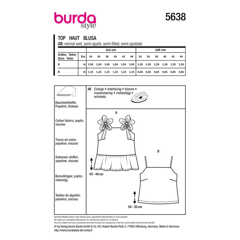 Burda Style 5638 innehåller två topmodeller i storlek 34 till 44. Båda har smala axelband och en luftig sommarkänsla i poplin, bomull eller viskos.