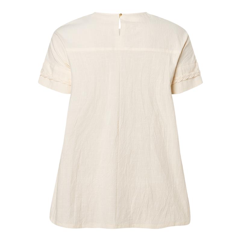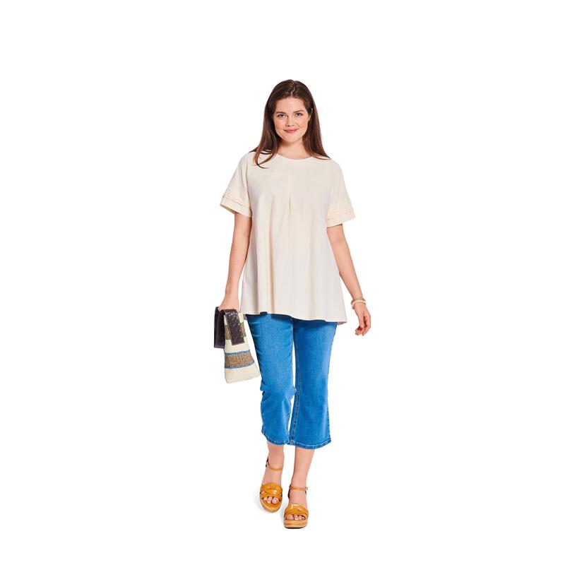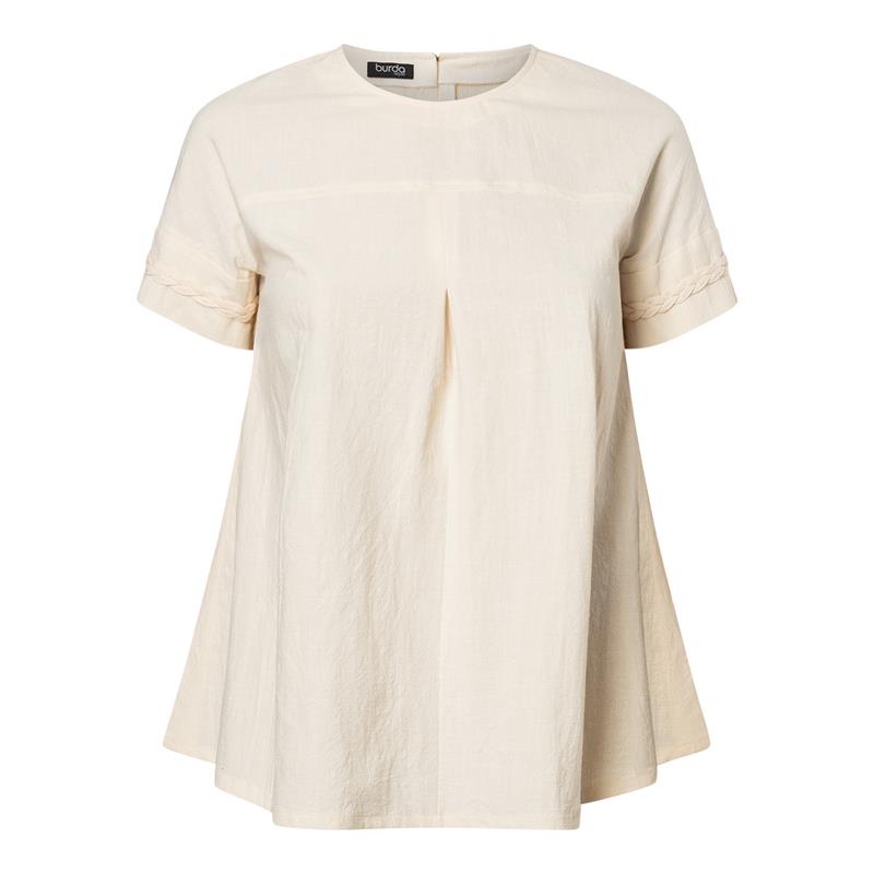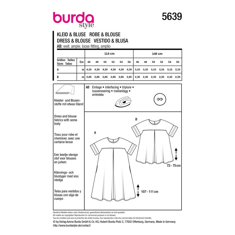 Burda Style 5639 innehåller en klänning och en blus i plusstorlekar 46 till 56. Båda har en ledig A-linjeformad silhuett med veck framtill och korta ärmar med dekorativa detaljer.