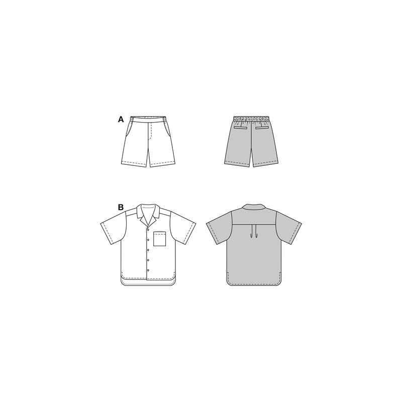 Modell A är shorts med resår i midjan och höftfickor. Modell B är en kortärmad bowlingskjorta med slagkrage, bröstficka och knappslå fram. Sy dem i samma tyg för ett matchande set eller kombinera fritt.