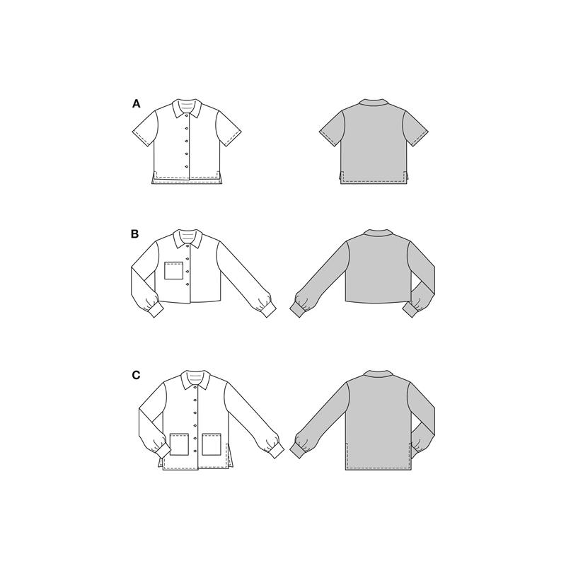 Modell A är en kortärmad skjorta med bröstficka. Modell B är en kort och lätt beskuren skjortblus med lång ärm och sidficka. Modell C är en klassisk längre skjorta med sidoslitsar, muddkrage och två påsydda fickor. Alla tre är märkta superlätt och ger snabbt resultat.