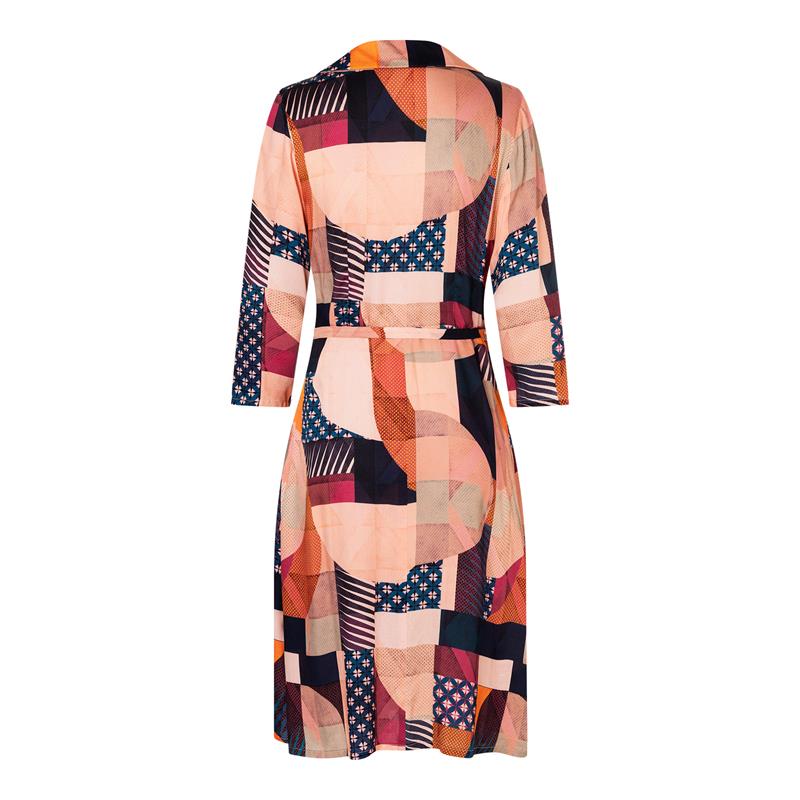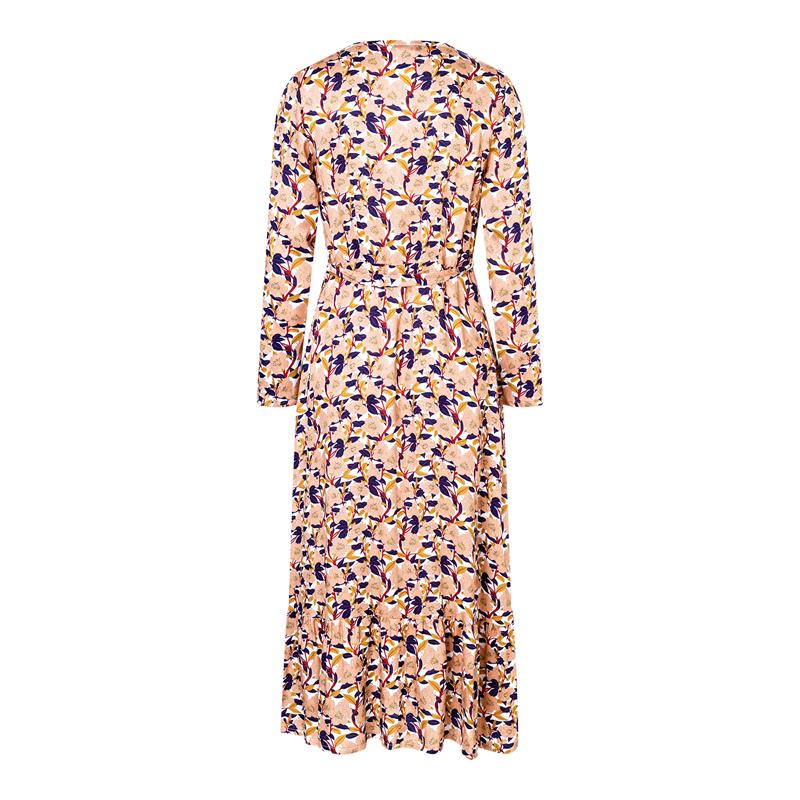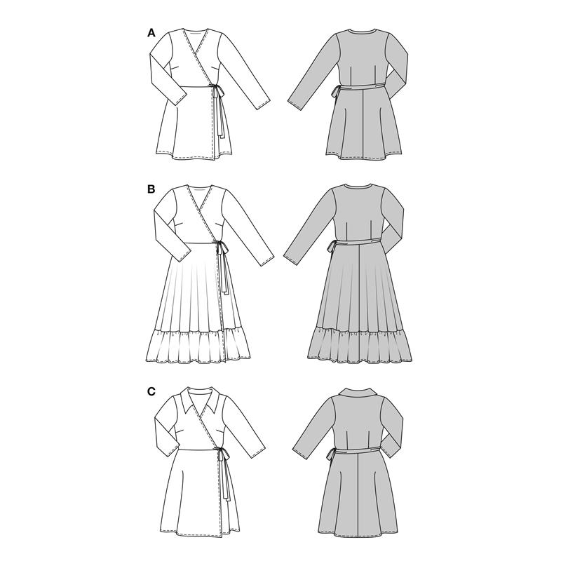 Modell A är en kort omlottklänning med mjuk passform. Modell B är en knälång variant med volang i fållen och valbara fickor i sidosömmarna. Modell C är en längre klänning med mjuk krage. Alla tre passar lika bra till vardag som till kläddare tillfällen.