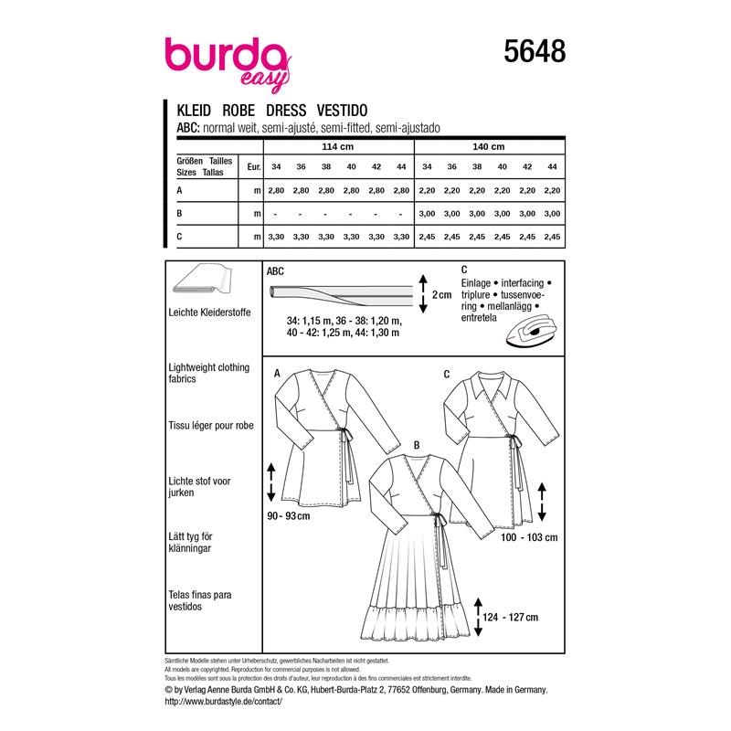 Burda Easy 5648 innehåller tre omlottklänningar i storlek 34 till 44. Alla tre är märkta superlätt och passar lätta vävda tyger.