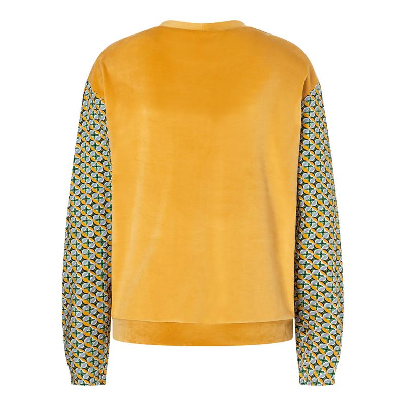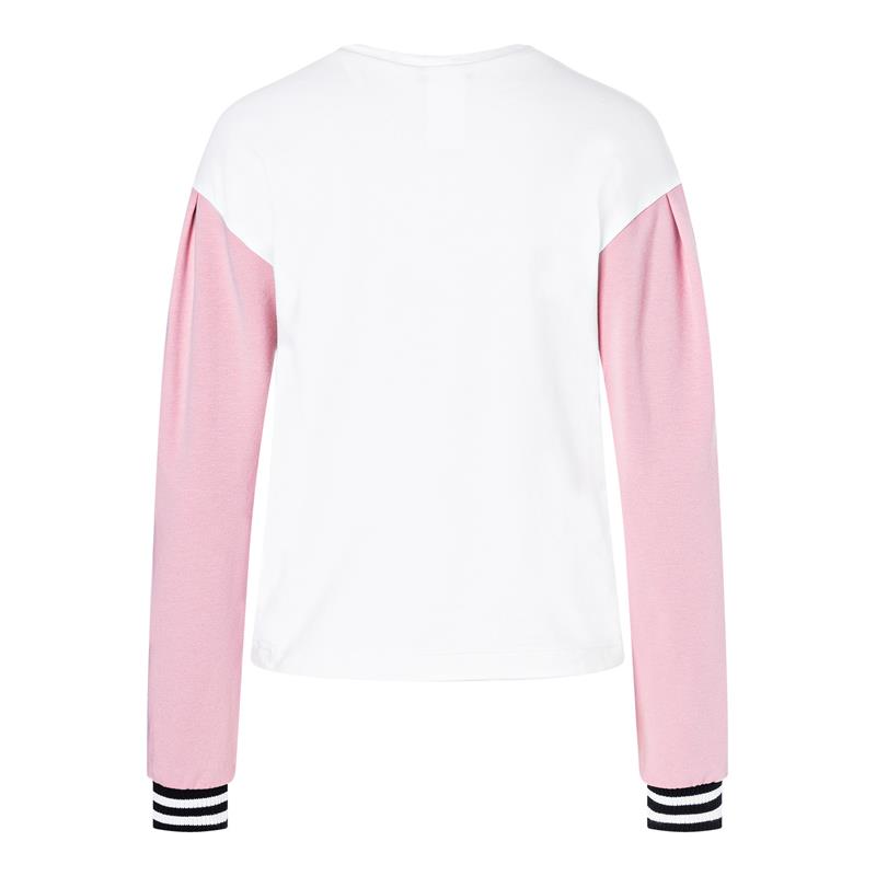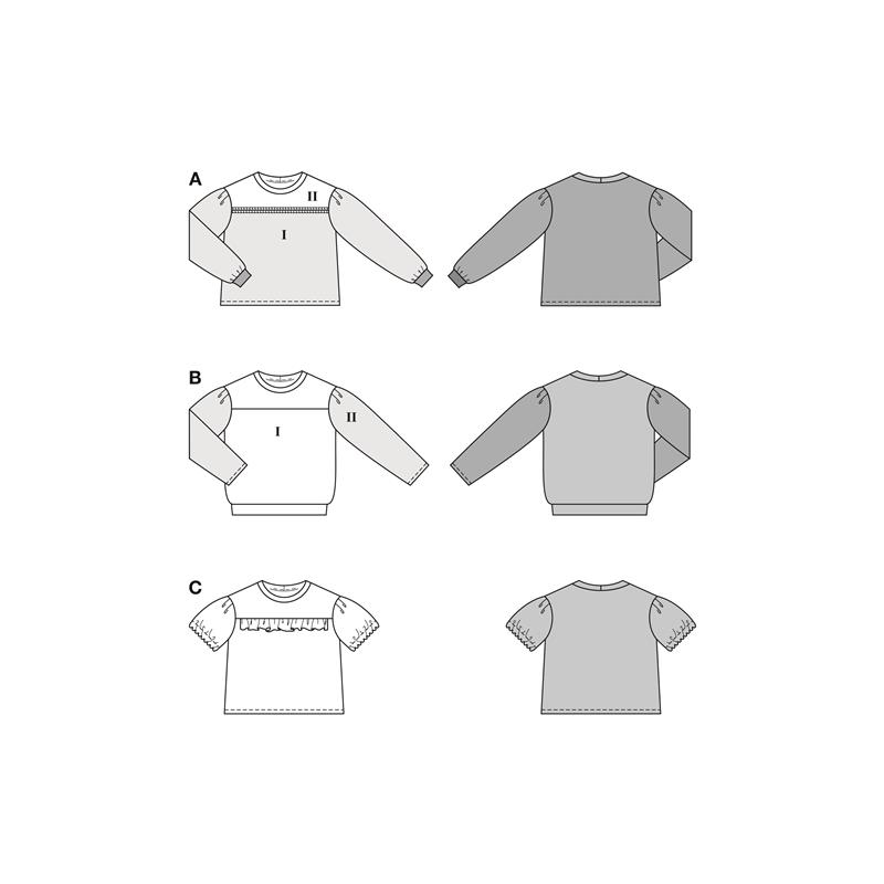 Modell A kombinerar två tyger med kontrastärmar och färdiga ribbmanschetter. Modell B har mjuk velour i kroppen med kontrastärmar i tryckt tyg. Modell C är en enklare sweatshirt med volang framtill. Alla tre ger avslappnade vardagslooker med lekfulla detaljer.