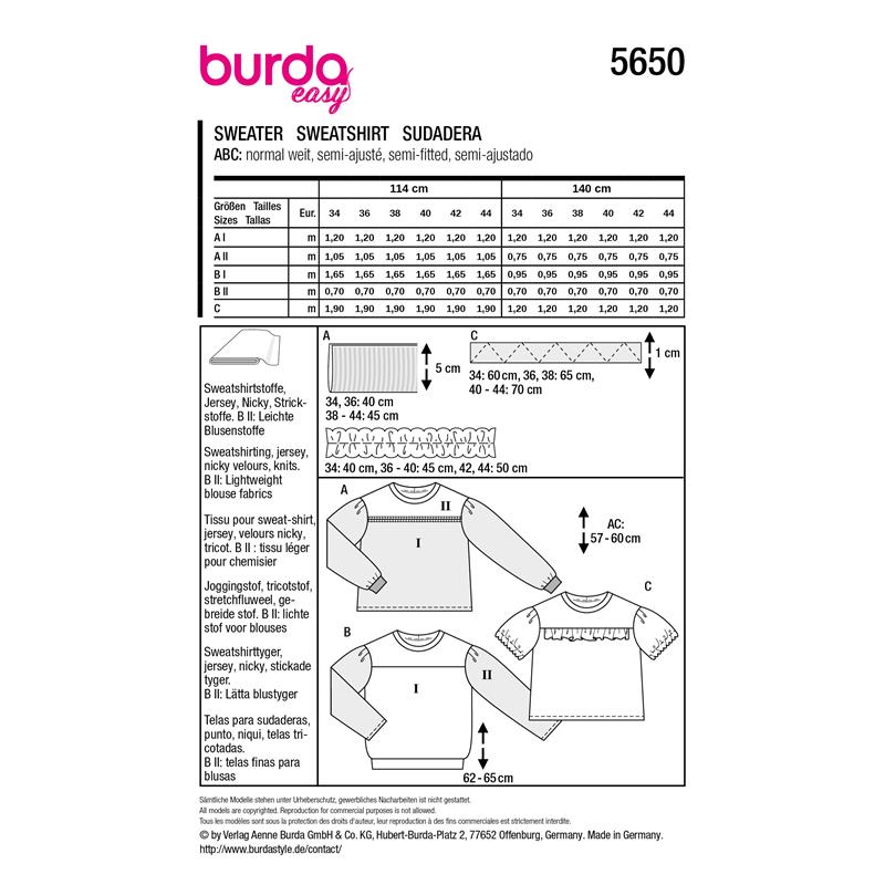 Burda Easy 5650 innehåller tre sweatshirtmodeller i storlek 34 till 44. Alla tre är märkta superlätt och passar jersey, velour och sweatshirttyg.