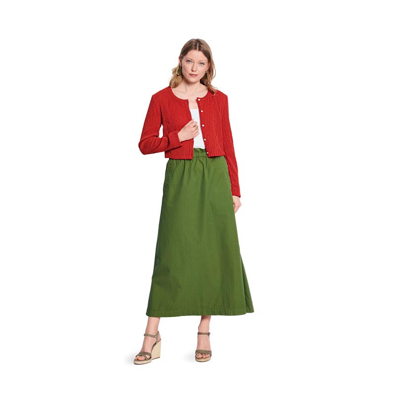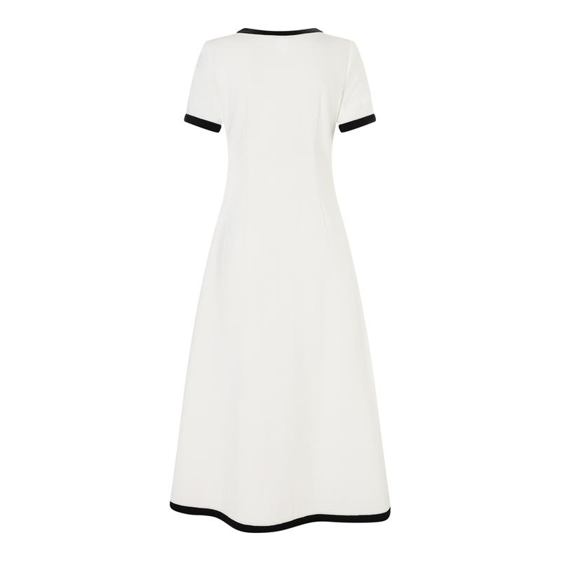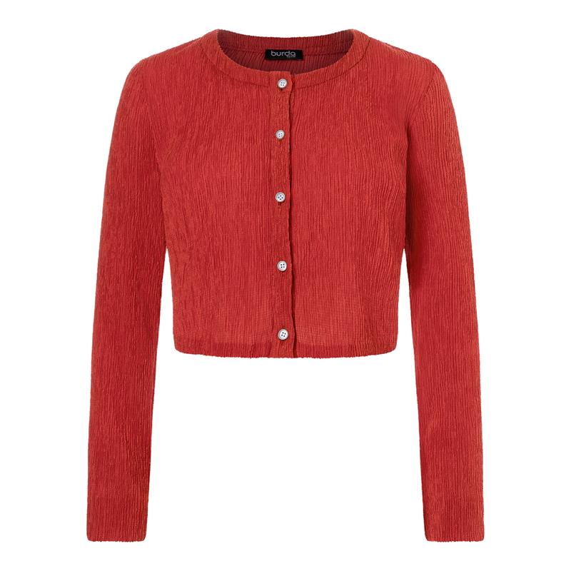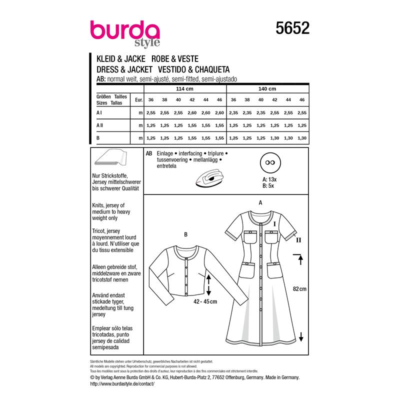 Burda Style 5652 innehåller en klänning och en kort jacka i storlek 36 till 46. Båda har en piké-inspirerad stil med kontrasterande kantdetaljer och dekorativa knappar, och sys i jersey eller stickat tyg.