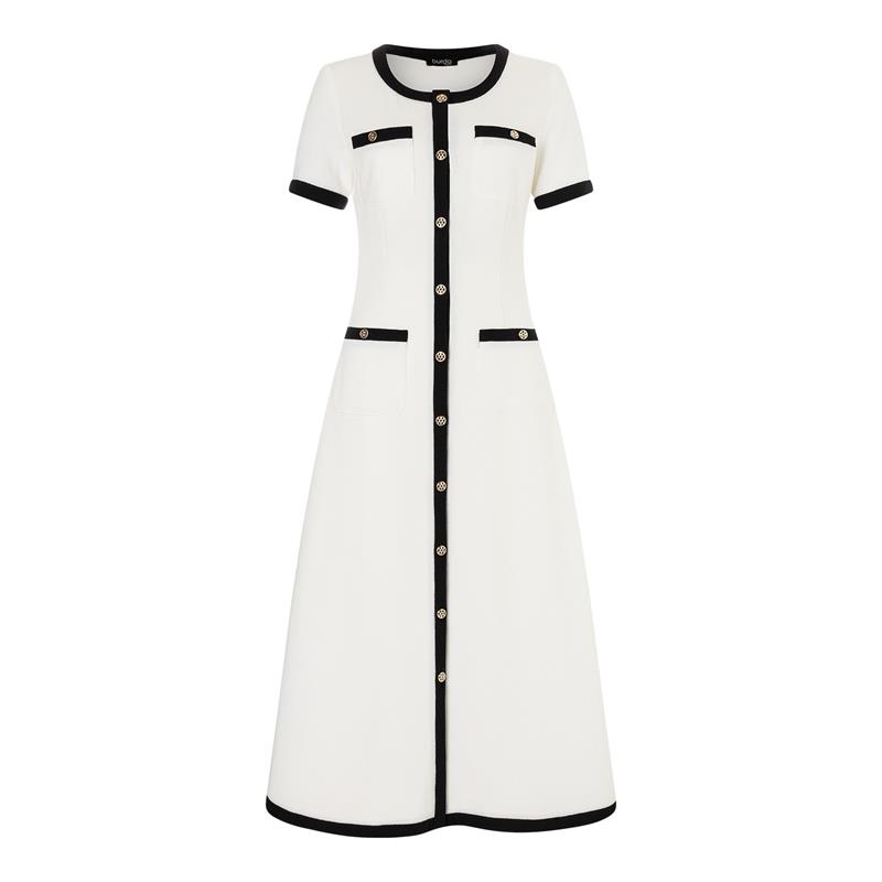 <ul><li>Klänning och kort jacka, storlek 36-46</li><li>Kontrastdetaljer och dekorativa knappar</li><li>Svårighetsgrad: lätt</li></ul>