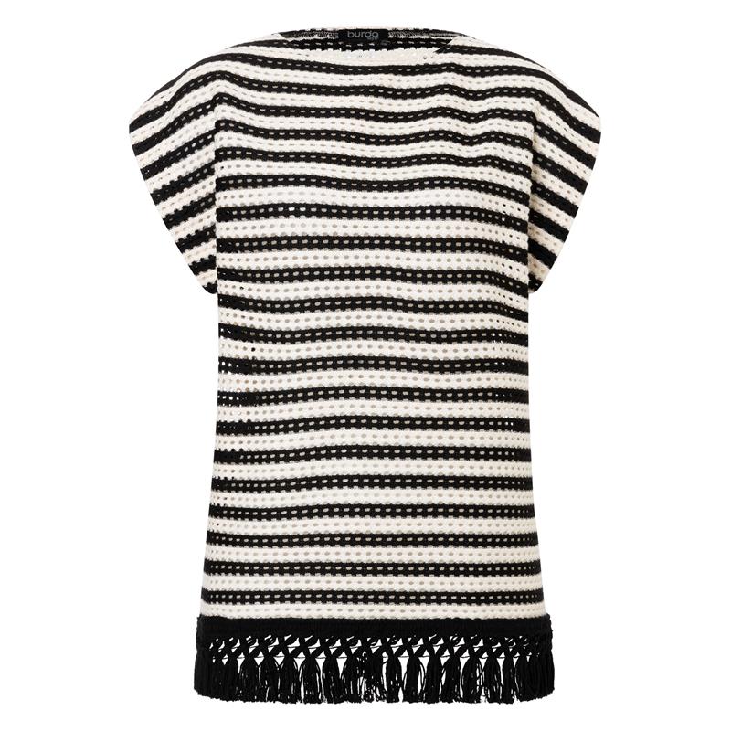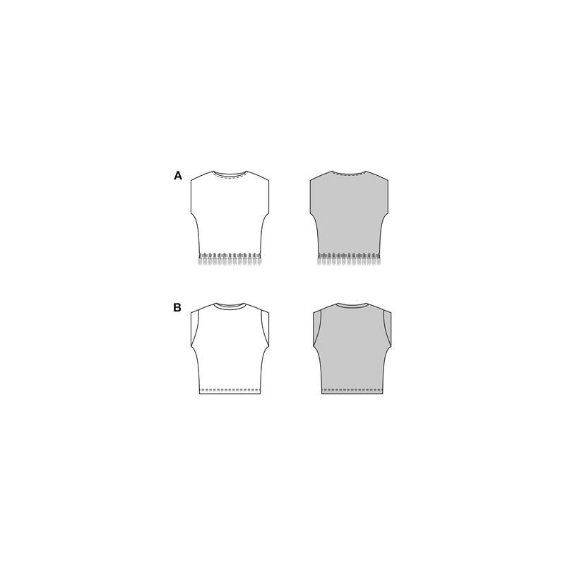 Modell A har holkärmar och fransade kanter längs botten, sy den i ett strukturerat stickat tyg för bäst effekt. Modell B är en enklare top med båtringning och lätt utsvängda ärmar. Båda passar lika bra till kjol och byxor.