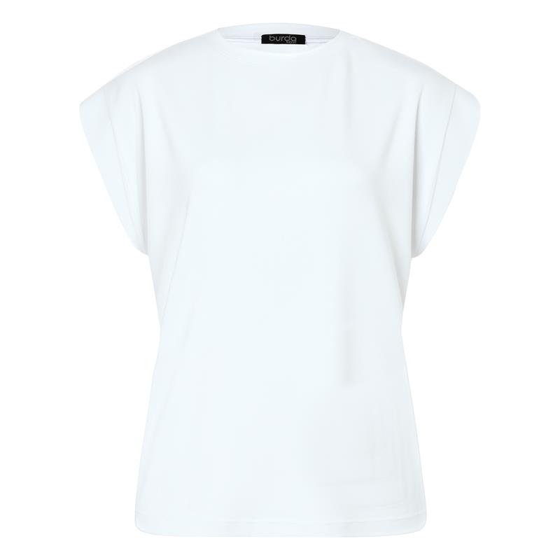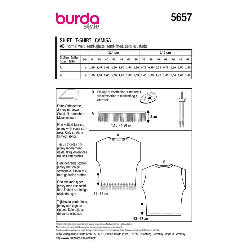 Burda Style 5657 innehåller två topmodeller i storlek 36 till 48. Båda har en avslappnad passform med nedsänkta axlar och passar jersey och stickat tyg.
