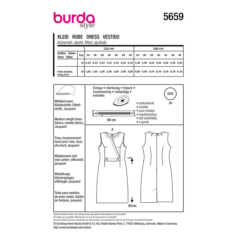 Burda Style 5659 är en figurnär klänning i storlek 34 till 46, inspirerad av 60-talets modeestetik. En omlotteffekt fram, stora dekorativa knappar och noggrant placerade sömmar ger klänningen en distinkt och genomarbetad karaktär. Sy i jacquard eller texturerade vävda tyger för bäst effekt.