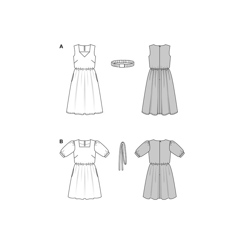 Modell A är en ärmlös klänning med fyrkantig halsringning och bred midjekant. Sy den i ett tyg med lite kropp för en strukturerad silhuett. Modell B har puffärmar, fyrkantig halsringning och en rosett i midjan. Längden kan enkelt justeras. Båda ger ett feminint och genomtänkt resultat.