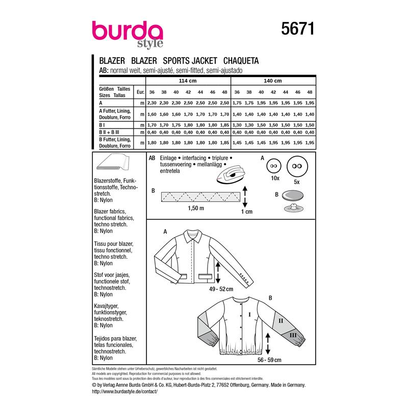 Burda Style 5671 innehåller två jackormodeller i storlek 36 till 48. Båda har en genomarbetad konstruktion och passar jacktyger, nylon och performancetyger.