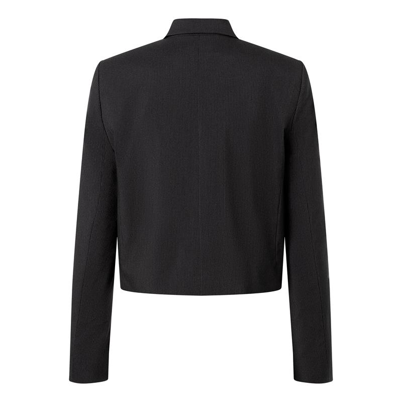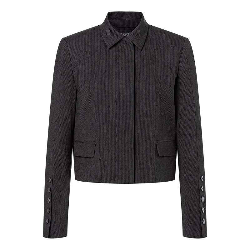 Modell A är en strukturerad och kort blazer med dold stängning, knappade ärmslut och en ren och skräddarsydd silhuett. Modell B är en sportig bomberjacka med färgblockerade ärmar i nylon och resårkant i midjan, med ett snördetalj som bälte.