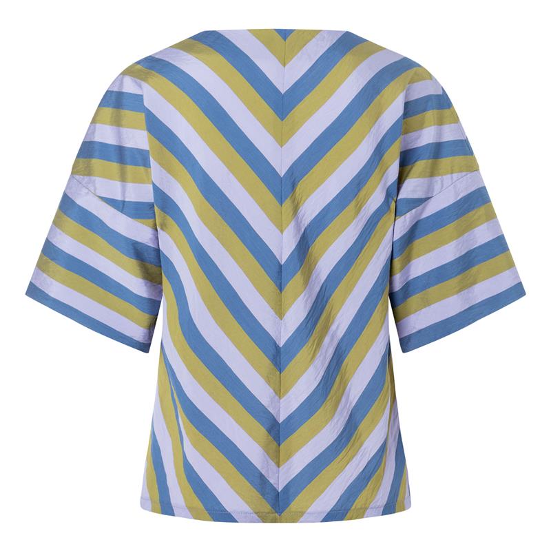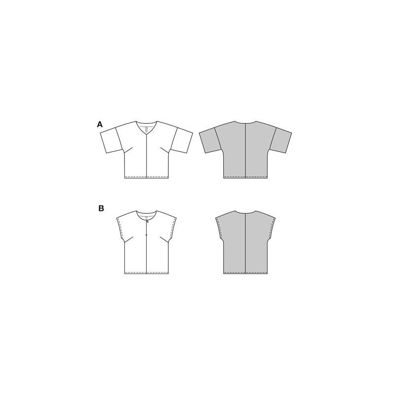 Modell A har nedsänkta axlar med breda ärmslut skurna i sträningen, och är tänkt för diagonalt randiga tyger där snittet används för att leka med mönstret. Modell B är en minimalistisk blus med infällda ärmar och en dragkedja i framsömmen som möjliggör en smal halsringning.