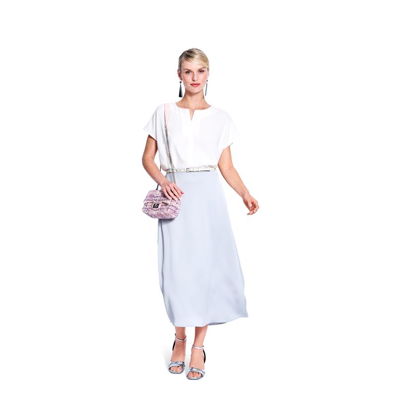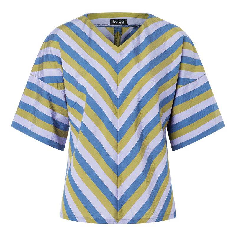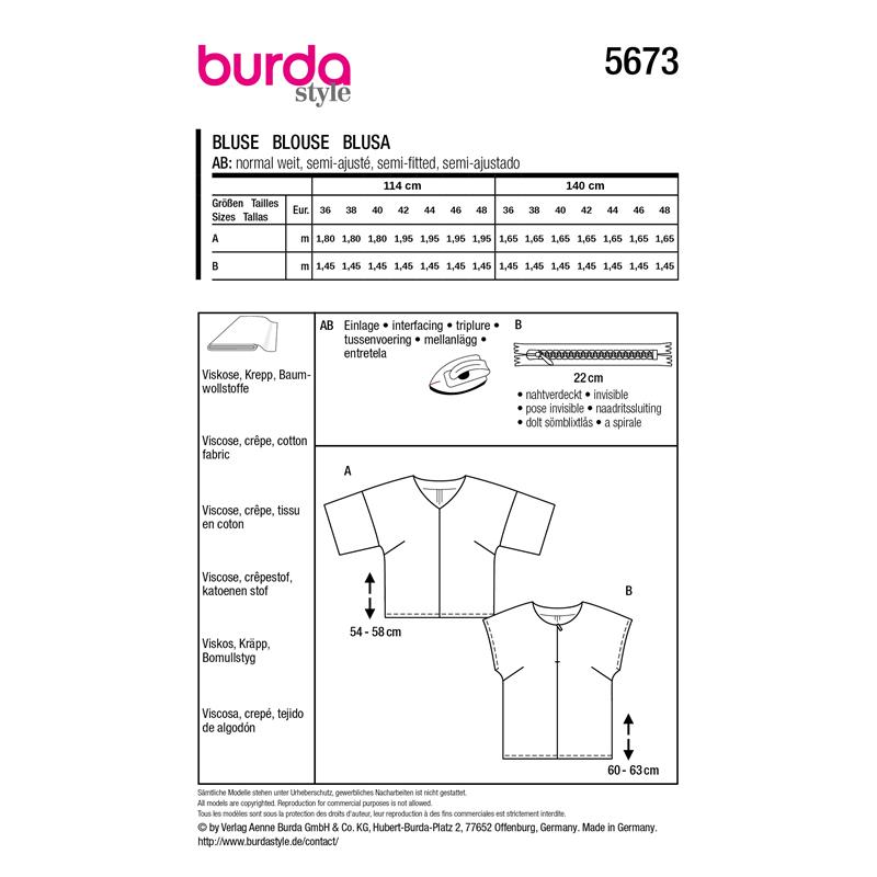 Burda Style 5673 innehåller två blusmodeller i storlek 36 till 48. Båda har en avslappnad och ledig passform och passar crêpe, bomull och viskos.