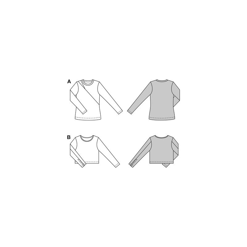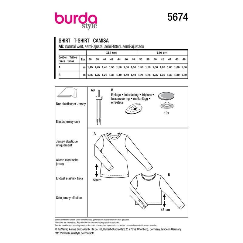 Burda Style 5674 innehåller två toppmodeller i jersey i storlek 36 till 48. Båda har långa ärmar och minimalistiska snitt med genomtänkta detaljer.