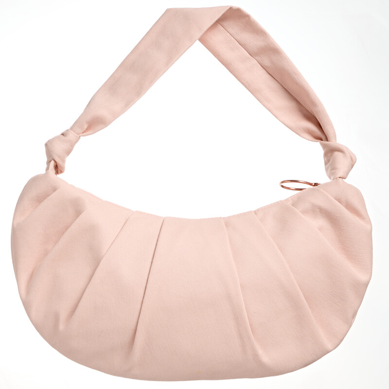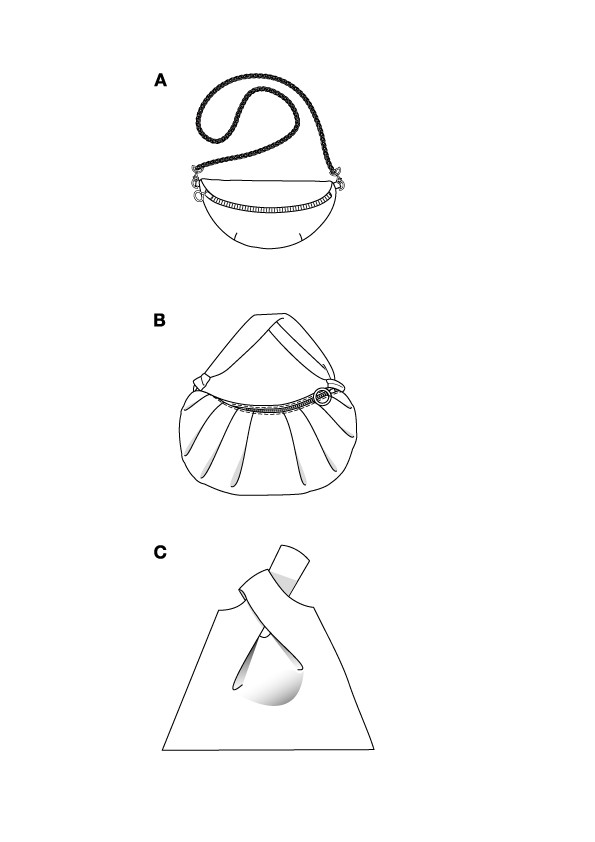 - A: Vliesofix. Band, 2 cm brett: 20 cm. Förvikta snedremsor 2 cm breda (färdig bredd 1 cm). 2 D-ringar, stegbredd 2 cm. Väskhandtag med karbinhake.