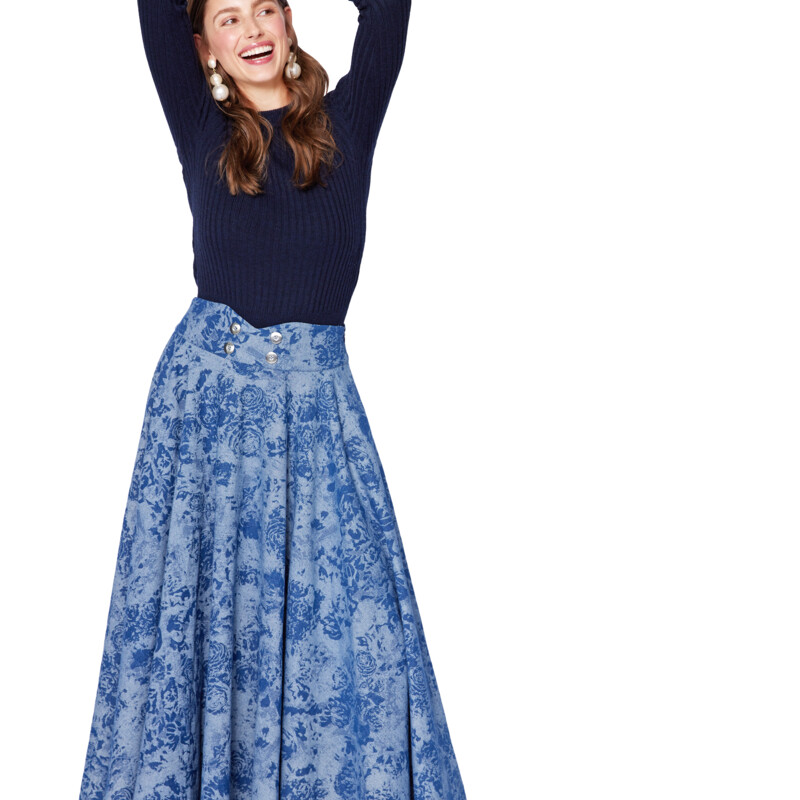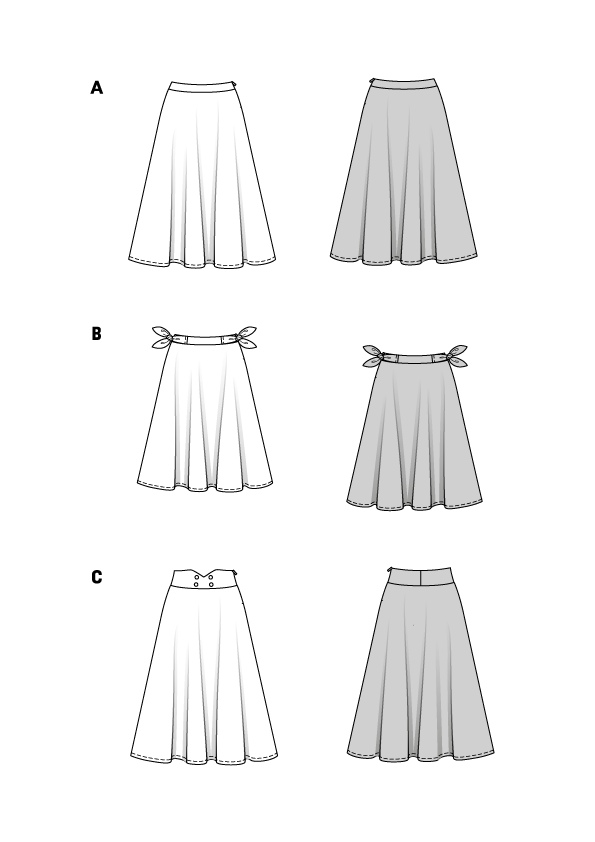 Upptäck de senaste kjolmönstren för nybörjare inom sömnad! Det första mönstret erbjuder en flödande, svängande kjol som är perfekt för danslektioner. Det andra mönstret kombinerar fransk elegans med rockabilly-stil i en knälång kjol med rosetter vid midjan. Det tredje mönstret skapar en elegant siluett med en lång, utsvängd kjol med bred midja och knappar - perfekt för speciella tillfällen!
