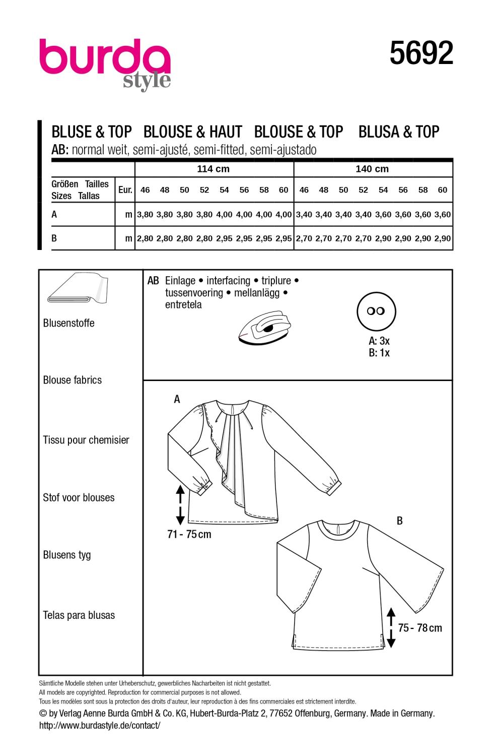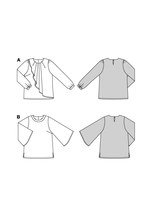 Detta mönster erbjuder två mångsidiga blus- och skjortalternativ, perfekta för erfarna sömmerskor. Tunikan har en stilren halsringning och 70-talsinspirerade klockärmar, idealisk för både mysiga dagar hemma och eleganta outfits med raka byxor och pumps. Den andra versionen imponerar med en dramatisk volang vid halsringningen som elegant draperar sig, avslutad med eleganta strassknappar på manschetterna. Perfekt för att skapa utseenden som verkligen sticker ut!