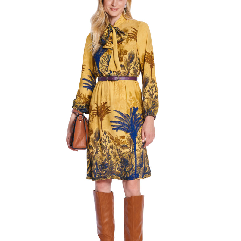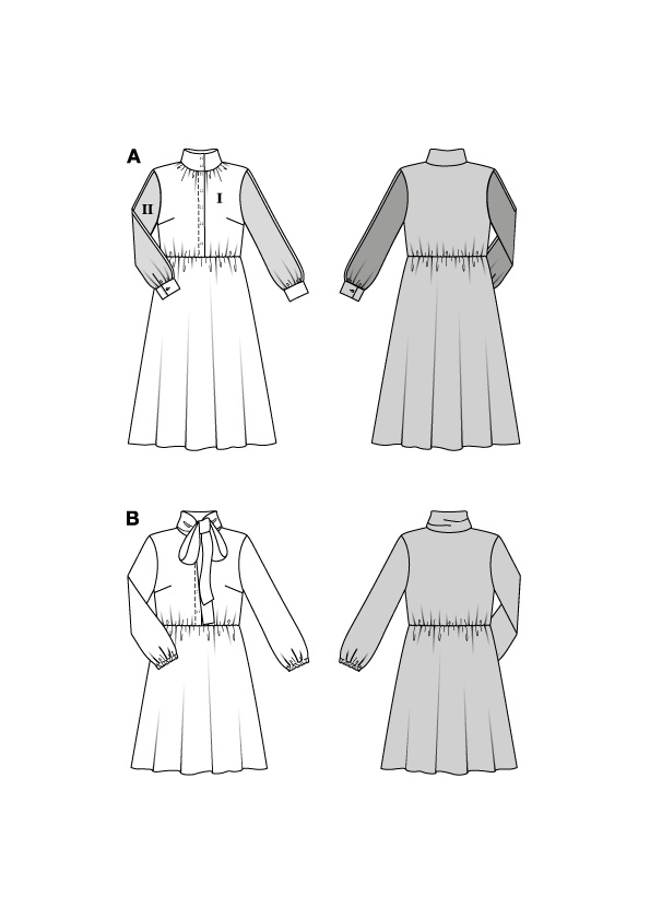 Detta symönster erbjuder två eleganta variationer – perfekt för den erfarna sömmerskan! Den första modellen kombinerar sportiga och feminina element med en ståkrage, dold knappslå och klockad kjol. Den andra modellen är mångsidig med en flik och elastisk midja, vilket gör den idealisk för middag, kontoret eller en fest. Klä upp den med en blazer och klackar, eller håll det avslappnat med ballerinaskor!