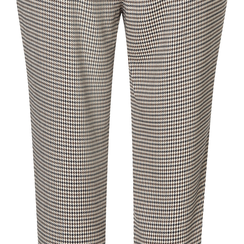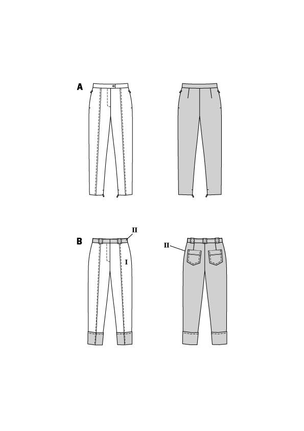 Detta symönster erbjuder två stilfulla byxversioner: De högmidjade byxorna med toppstitchade veck ger en bekväm passform och förlänger benen tack vare den breda midjebandet och stretchtyget. Den andra versionen använder kreativt resttyger på midjebandet, bältesöglorna och fållen, vilket ger charm med bältesdetaljer och uppvikta muddar. Perfekt för erfarna sömmerskor som söker en ny utmaning!