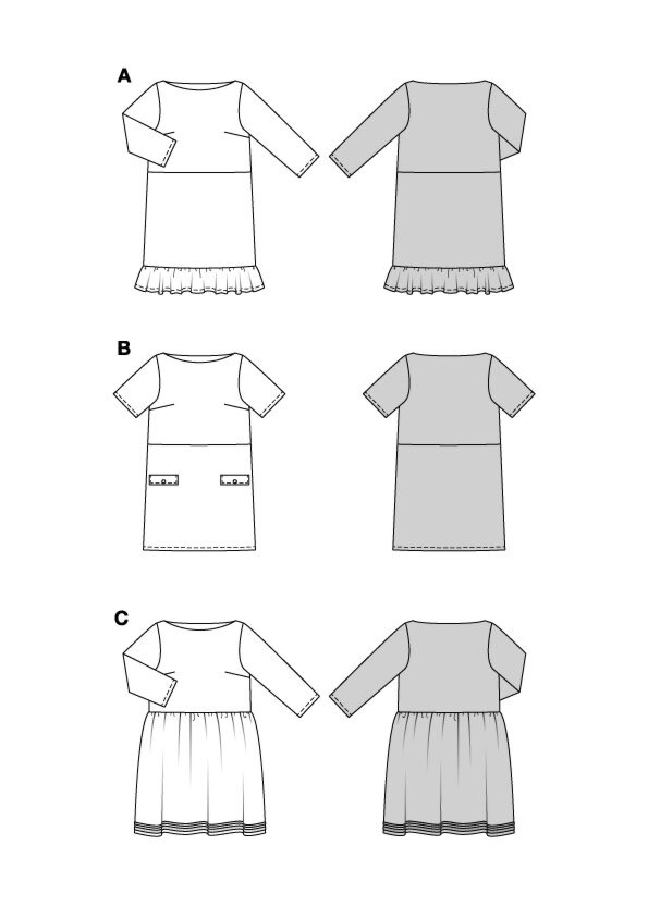 Det mångsidiga klänningsmönstret erbjuder gott om utrymme för individualitet och! Sy en enkel klänning från Burda med vichy-rutor, en båtringning och volang i fållen eller en klänning med sextiotalstouch tack vare korta ärmar och våffelpiké. För höstlooken, styla enkelt med en kavaj, strumpbyxor och stövlar. Den vida kjolversionen med hög midja och dekorativa detaljer passar för en feminin look. Tre stilfulla klänningsmodeller i ett på svårighetsgrad 1!
