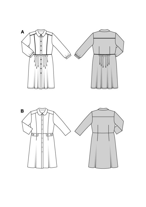 Två skjortklänningar i olika stilar: Vy A är gjord i lätt tyg och har ärmband vid handlederna och en samlad kjol. De pipade sömmarna är en extra speciell detalj. Kjolen på klänningsvy B är slank och de smala ärmarna är 3/4-långa. Dekorativa flikar är fastsatta i midjesömmen.