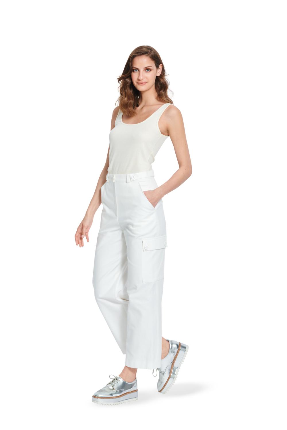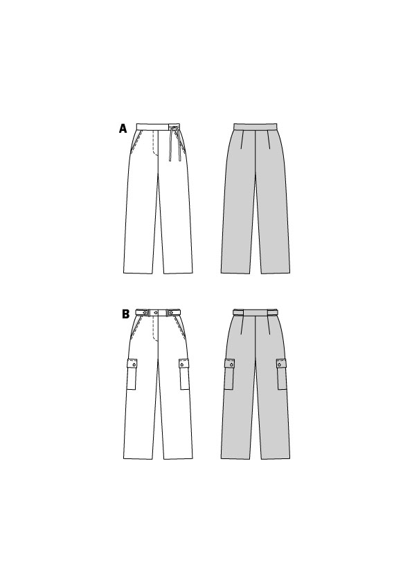 Rakskurna byxor med höftfickor och intressanta detaljer! Midjebandet på vy A är fäst med knytband. De påsydda fickorna och flikarna på midjebandet på vy B ger en måttlig nick till cargostilen.