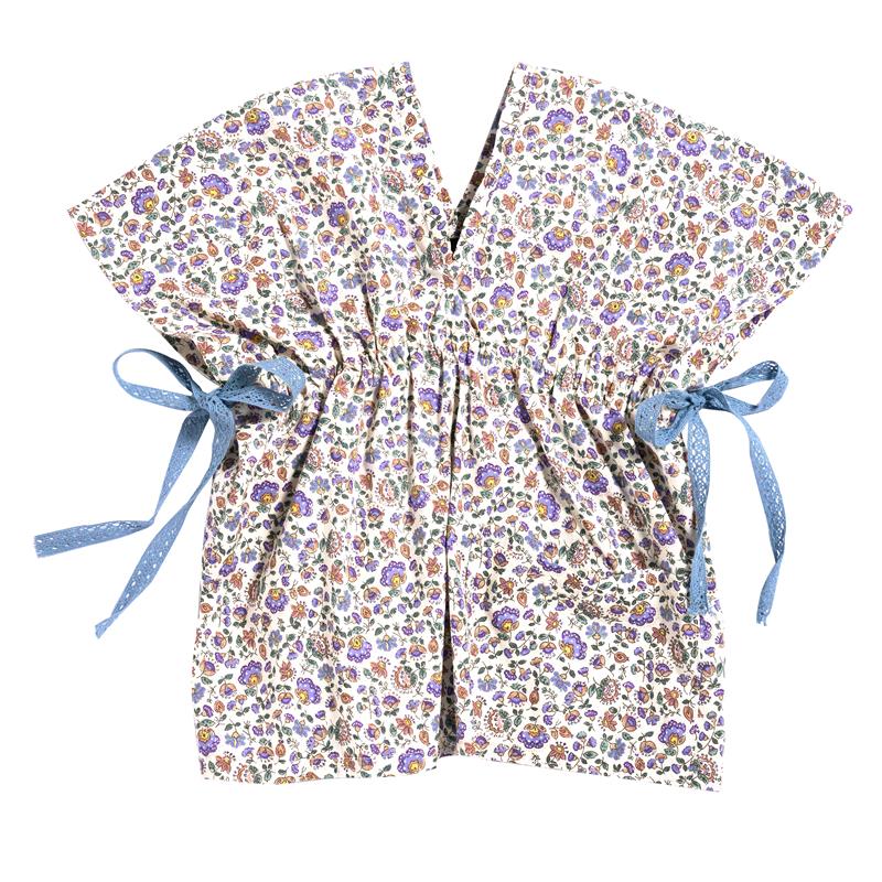 Ett mjukt och bekvämt set för de minsta: omlottblus med knytband i sidan och vida byxor med resår i midjan. Luftiga plagg som är lätta att ta av och på, perfekta för vardagsbruk i sköna sommartyger.