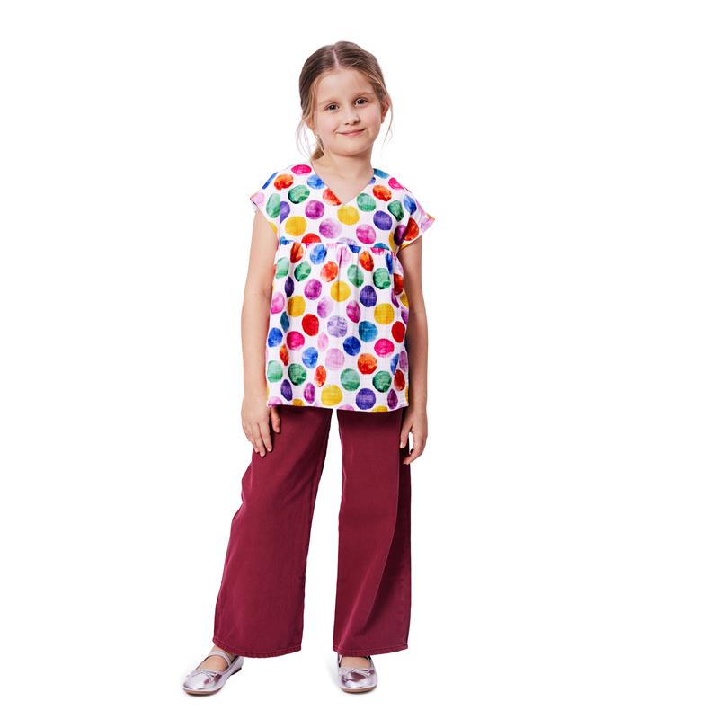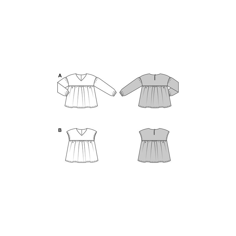 Två lättburna blusar för flickor i mjuka bomullstyger. Rymliga modeller med enkla konstruktioner som passar bra som vardagsplagg. Går snabbt att sy och fungerar fint som nybörjarprojekt.