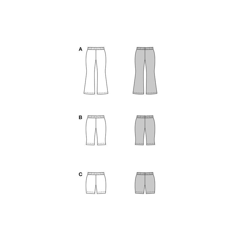 - Tre modeller i ett mönster: utsvängda byxor, capri och shorts
