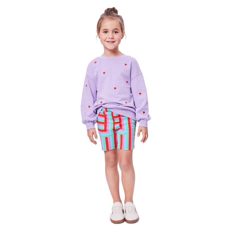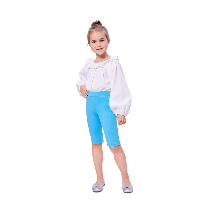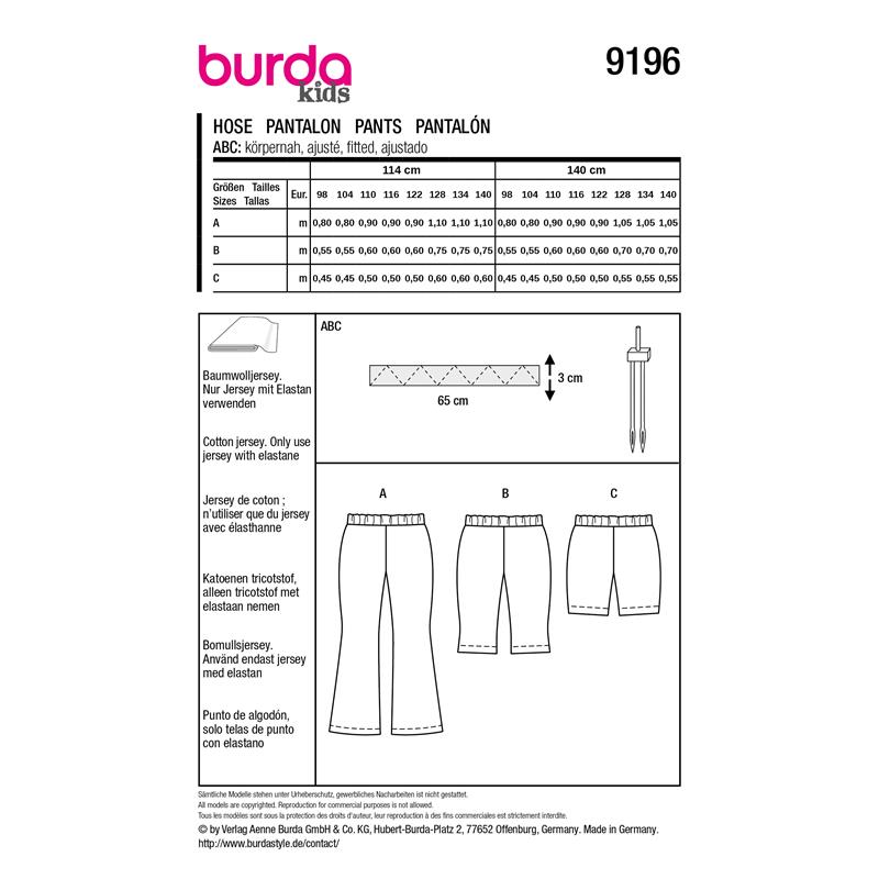 Burda Kids 9196 innehåller tre byxmodeller i jersey för barn i storlek 98 till 140. Alla modeller har bred stretchig midja och sys i jersey med elastan.