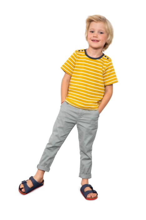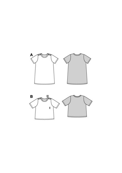 Den sommarfavoritklänningen, bara sätt på den och redo - perfekt för hektiska morgnar. Knapparna kan öppnas på båda sidor så att huvudet får plats. Den lösa t-shirten är en bra grund för barn. Halsringningen i kontrasterande färg är en speciell blickfångare. Med en långärmad tröja under blir sommartröjan en vintertopp. Två mångsidiga mönster i en uppsättning, allt på svårighetsgrad 2!