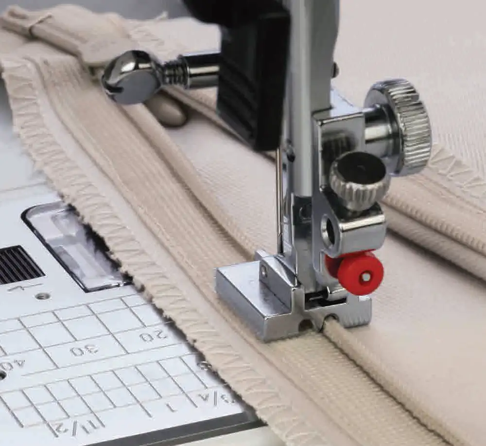 För enkel sömnad av “osynlig blixtlås”. Rullar ut blixtlåsspiralen så att raksömmen ska komma så nära spiralen som möjligt.