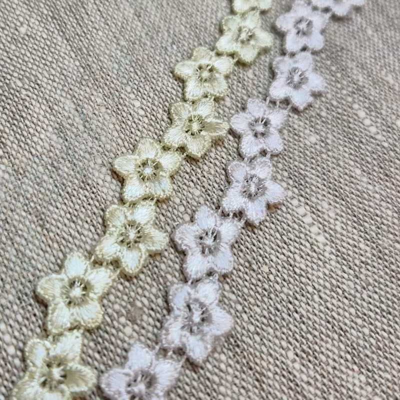 Broderad spets med blommor. Blommorna är cirka 1,3 cm breda. Då bandet är vågigt så är bredden lite ojämn. Dvs. cirka 1,3 - 1,6 cm.