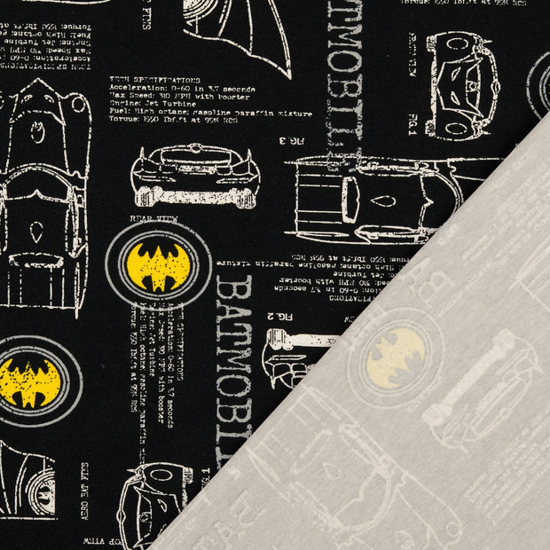 Ett häftigt bomullstrikåtyg med tekniska ritningar av Batmobilen och Batman-emblemet mot en svart bakgrund. Tyget är perfekt för att skapa unika och bekväma kläder som tröjor, tights eller pyjamasar, och är ett måste för små och stora Batman-fans!