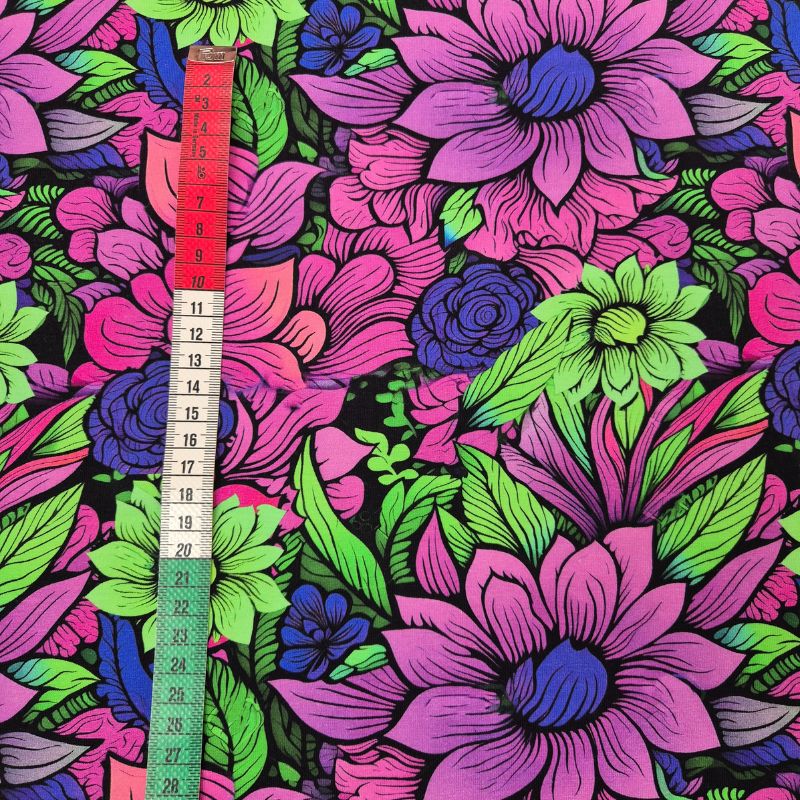 Ett livfullt och färgstarkt trikåtyg med stora blommor i neonrosa, lila, grönt och blått mot svart botten. Tyget har en mjuk, stretchig och följsam kvalitet som gör det bekvämt att bära och enkelt att arbeta med.