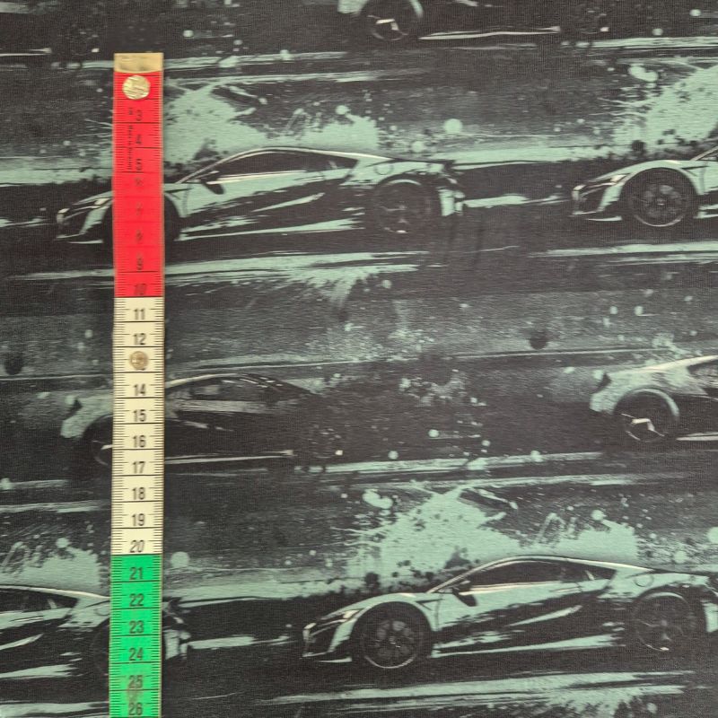 Ett tufft digitaltryckt trikåtyg med snabba sportbilar mot en mörk bakgrund. Mönstret har en dynamisk, målerisk effekt med färgstänk som förstärker känslan av fart och rörelse.