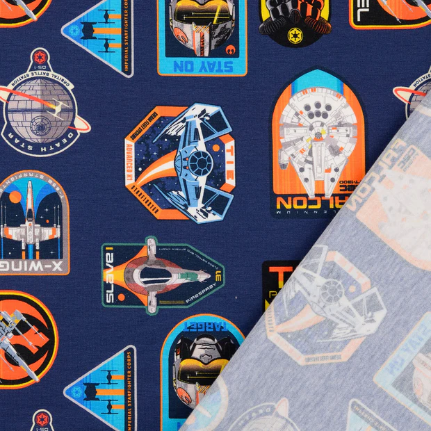 Ett fantastiskt bomullstrikåtyg med Star Wars-motiv, fyllt med rymdskepp som Millennium Falcon, X-Wings och TIE Fighters, samt ikoniska inslag som Death Star och rebellmärken på en mörkblå bakgrund. Perfekt för att skapa kläder till alla Star Wars-fans, såsom tröjor, leggings eller pyjamasar.