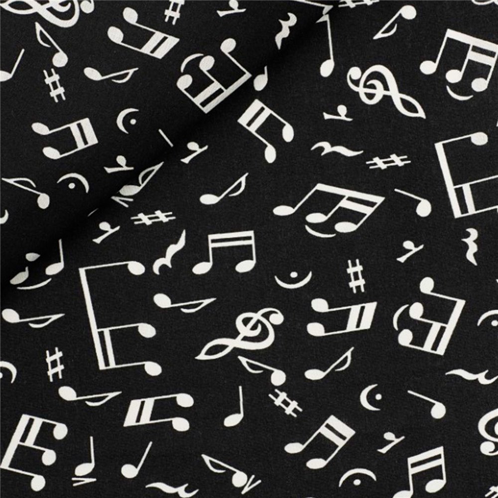 <ul> <li>145 cm bred – 110 g/m²</li> <li>100% bomull</li> <li>Svart tyg med vita noter</li> </ul>