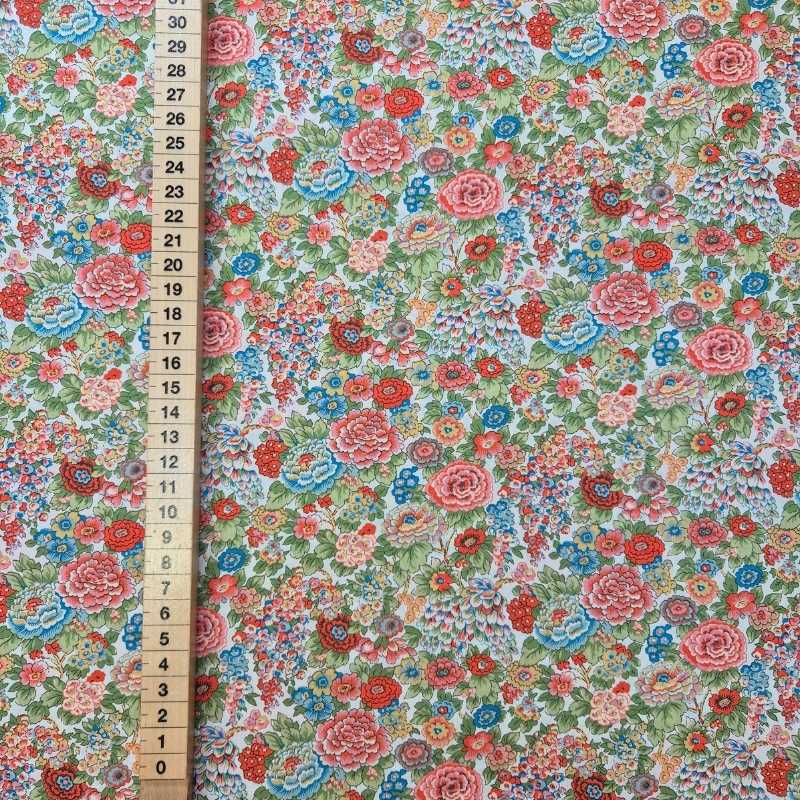Elysian Day är ett rikt och detaljerat Liberty-mönster med ett tätt myller av blommor i rosa, rött, blått och grönt mot ljus botten. Pioner, rosor och mindre vildblommor blandas i en livfull komposition som fyller hela tyget. Tryckt på Tana Lawn i 100% bomull.